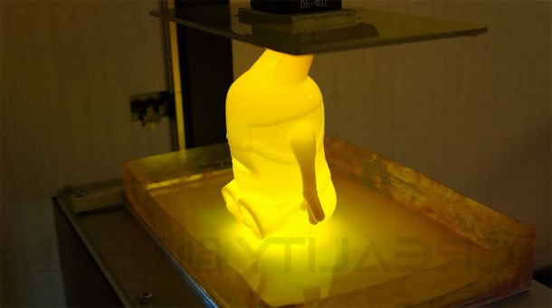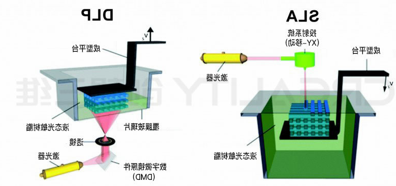 用以3D打印的数字光处理技术(DLP)源于20世纪80年代末美国德州仪器公司推出的图像投影技术,与SLA的点状投射不同,可投射并聚合一整层,当光线照射到树脂上时,它不会像SLA那样局限于单个光斑,而是整个层一次形成。