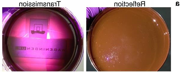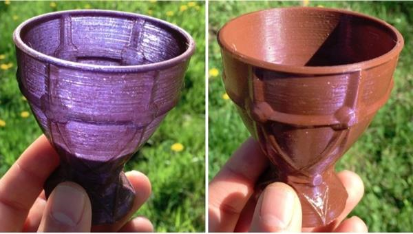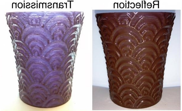 然后,他们将二向色金纳米粒子溶液注入聚乙烯醇(PVA)中,这是一种塑料,通常用于在3D打印时在水中溶解时产生支撑物。将塑料挤出成长丝,可用于任何标准FDM 。材料中打印的3D部件看起来是棕色的,前面有光线照射,但是在它后面放了一盏灯,它变成了透明的紫色。
