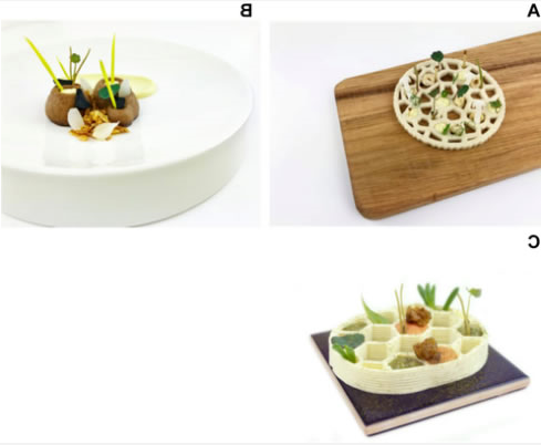 Jan Smink制作的3D打印碟照片。(a)芹菜榛子酱,(b)贝伦哈普2.0咖喱酱,(c)3D打印机奶油干酪。