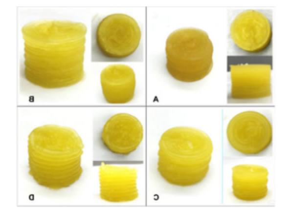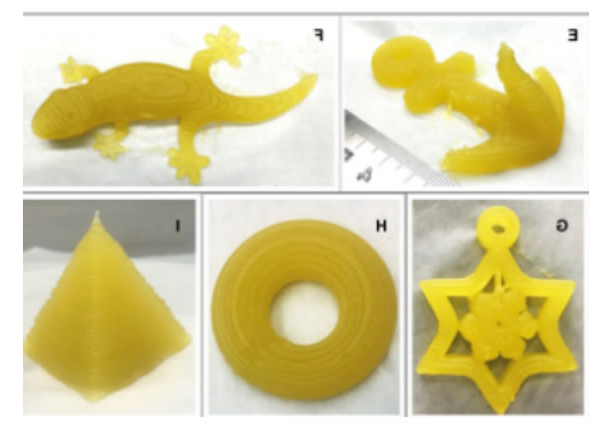 柠檬汁凝胶印物图片。(a)–(d)是具有不同喷嘴直径(a=0.5 mm,b=1.0 mm,c=1.5 mm,d=2.0 mm)的气缸。(e)–(i)是以24 mm3/s挤压速率、30 mm/s喷嘴移动速度和1.0 mm喷嘴直径(E.Anchor、F.Gecko、C.Snowslake、D.Ring、E.Tetrahedron)打印的产品(Yang等人2018)