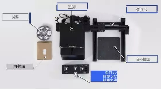 1、 做你们领到CP-01后,卸开打包,会看过龙门架、支撑架、电脑加工品台、3D直接打印头、CNC电脑加工头、二氧化碳激光电脑加工头、消耗品还有零部件包。