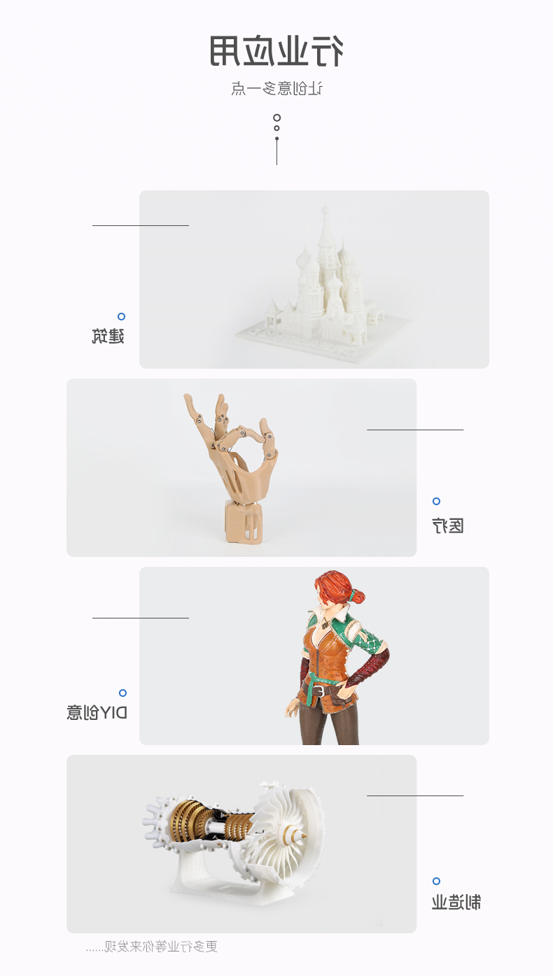 最后还有整套产品和服务。除开售后维修服务,如使用说明书、技术指导和维护保养,3d打印机产品的硬件、软件、耗材和教材对初学者用户也很重要。