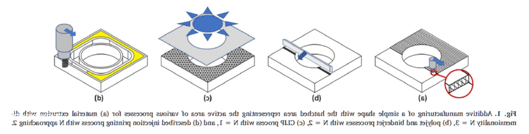 (a)FFF技艺 (b)黏接剂压喷射技艺 (c)Carbon的DLS技艺 (d)选文说的注入打印文件技艺