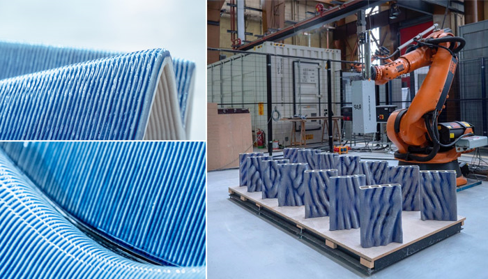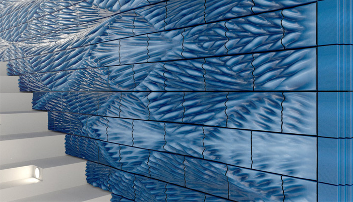 似乎在这些瓷砖的3D打印背后是机械臂,我们想象一种粘土挤压工艺。一旦零件变硬,它可能已被上釉,也就是说,覆盖有这些蓝色和白色层,使其具有非常美的最终外观。