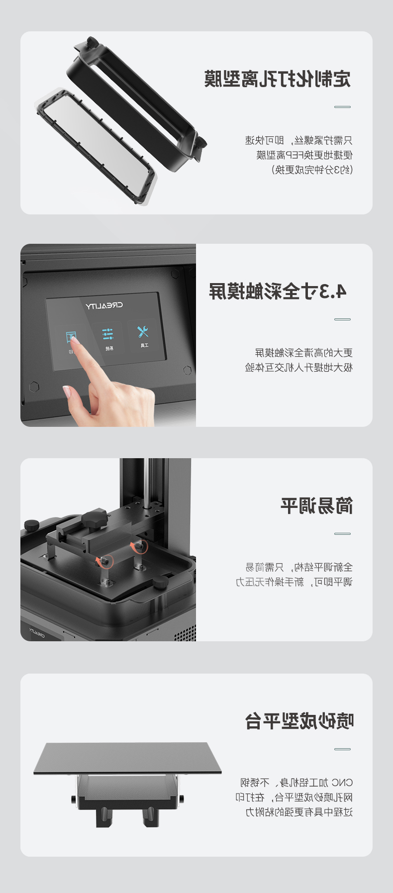 除打印安稳以外,LD-006还有着诸多对于用户体验的精心设计:定制化打孔离型膜,用户只需拧紧螺丝,即可快速便捷地更换FEP离型膜。4.3寸全彩触控屏,一切从简的UI界面,带来简洁高效的操作体验。简易调平功能,让3D打印初涉者也能轻松完成精准调平。