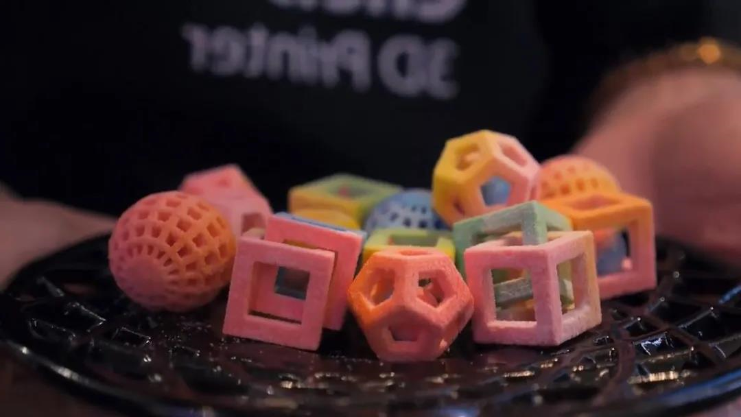 下面的几何形状糖果是由专门的糖果3D打印机打印而成,同传统糖果制作相比,3D打印糖果在造型上更加自由,制作流程更简便。