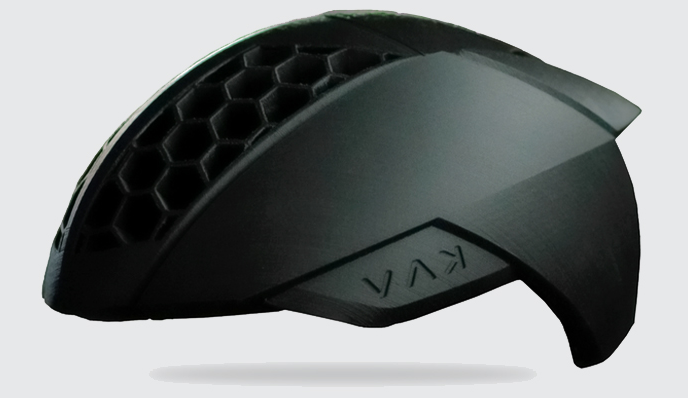 据制造商称,这款自行车头盔选用专有聚合物和FDM3D打印机设计,不但能吸收冲击力,还能最大限度地增加头部周边的气流。所探讨的聚合物是TPU的混合物,它很轻,因而会限制冲击。依然根据KAV的说法,头盔的重量应小于300克(约0.66磅),而且将使用精度为50微米的机器进行打印。