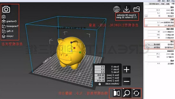 模型修改而言,可以先查看模型的状态,具体修改模型的填充率、支撑设置、摆放角度、尺寸,还可以预览打印时间,耗材长度和重量。