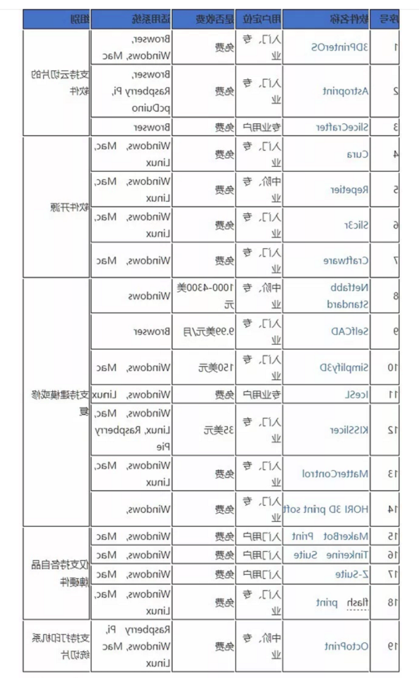 以上分享的19款3D打印软件并非全部,前提是针对桌面级的FDM技术的切片软件,暂时还没有涉及光固化技术、专业级和工业级打印机的软件,在我看来,3D打印机的“软”实力和“硬”实力同等重要,针对不同的打印机、不同的模型去做不同的模型切割、不同的角度摆放、不同的切片参数和打印控制,最终的目的是尽量少支撑、最快速度、最好品质的打印模型,而国内的FDM打印机用户中,DBS的刘泳岐团队对打印参数和切片控制的研究最深,在此感谢泳岐团队给出的建议和FDM 3D打印参数控制方面做出的研究。