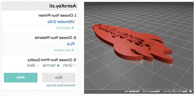 如果用户没有要打印的3D模型,可以从Web服务下载,例如搜索引擎Yeggi、存储库CGTrader或Thingiverse下载。也可以在基于Web的3D建模工具3DSlash和Leopoly中从头开始设计3D模型。如果用户的3D模型无法正确打印,可以将Astroprint连接到3DPrintCloud进行修复。如果用户没有自己的3D打印机,也可以通过i.materialise打印模型文件。