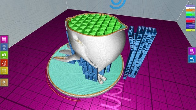 用户UI界面确实令人耳目一新。这款3D切片软件能够进行基本编辑并为3D模型创建支撑结构,可以快速选择Tinkerine 3D打印机的设置。
