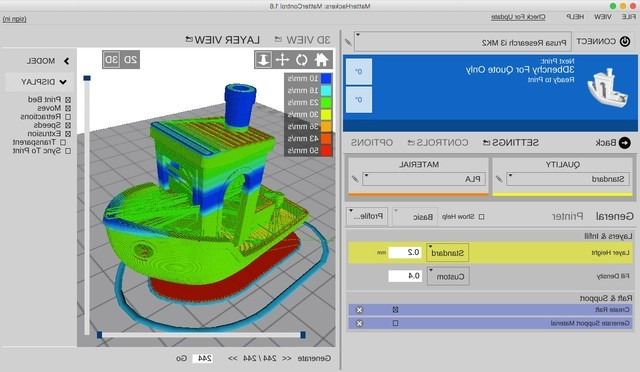 MatterControl具有三个切片引擎(MatterSlice,CuraEngine和Slic3r),用户可以切片对比打印结果。在基本模式下,可以调整图层高度、填充密度、支撑材料和筏,保存设置应用于连续打印。具有自动修复功能,支持多个打印头。为了预测打印可能出现的问题,用户可以逐层预览整个过程。