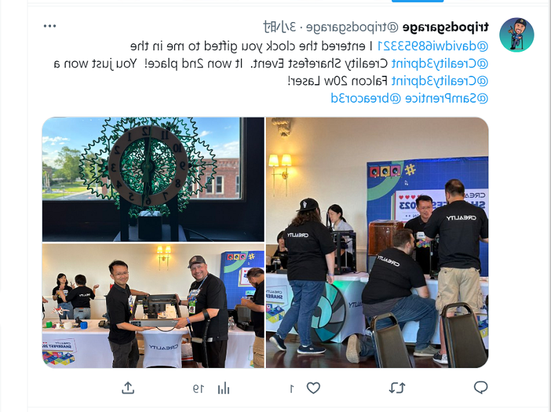 为此碰面会领取了组织消费者组、前辈的相符一致好评,在众多网社群网站上各微博大v、消费者组均对生活强烈反响强烈。领取头等奖的微博大v@pretzelprints3d 标识很兴奋在生活中领取K1 Max,自身将用这台POS机为3D彩打范畴所作一些有社会价值的电影,并对创想3d立体开展的为此生活及为世界各国3D彩打社群网站所做的任何标识衷心感谢。生活领导人Sam和Matt也在创想3d立体Facebook分组Creality Official User Group中分刘海别发外链标识很幸福与创想3d立体相互合作、添加为此生活,评论留言区交互同时也是好玩至尚。